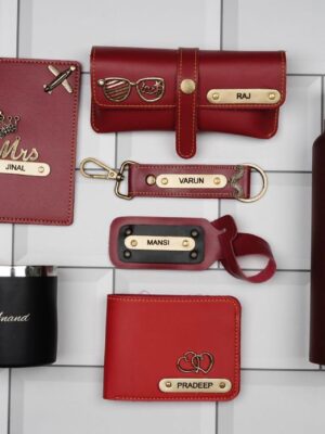 Personalized Brother / Bhai Rakhi Combo Y 4.0, a perfect gift for men on Raksha Bandhan which contains a Leather wallet, Keychain, Passport cover & Eye wear Case, Chocolate & Name Rakhi. The name is engraved on metal strip & also includes a New Classic Bottle.