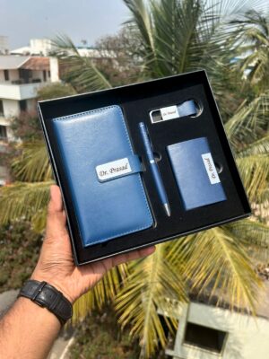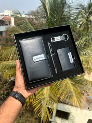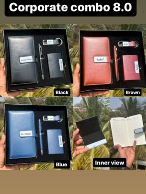 This Premium Corporate Combo 8.0 includes a selection of useful and practical items that can be used in a professional setting. The items you mentioned, are a small diary, a card holder, a pen, and a keychain.