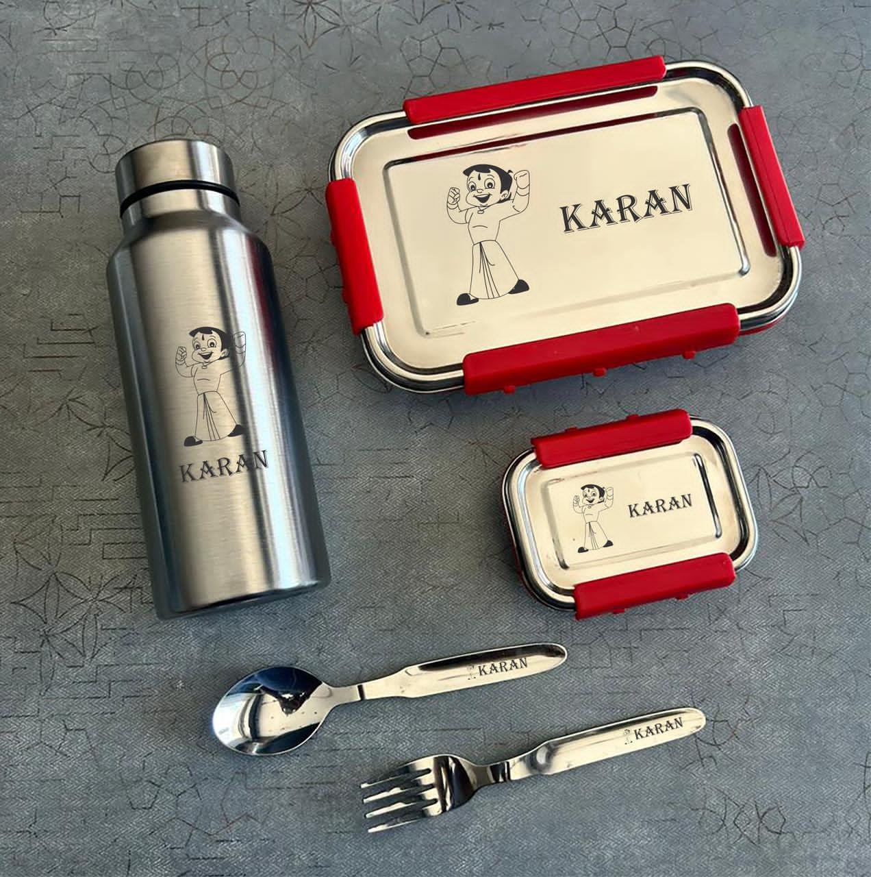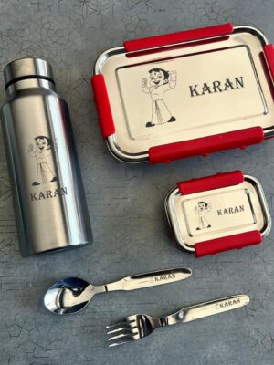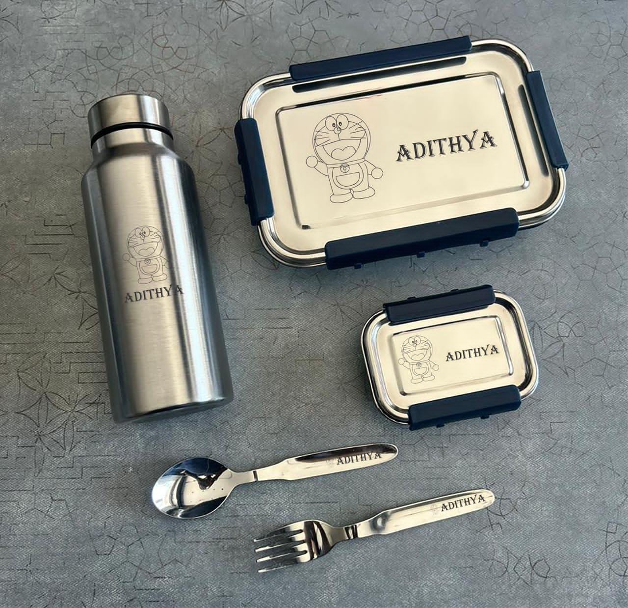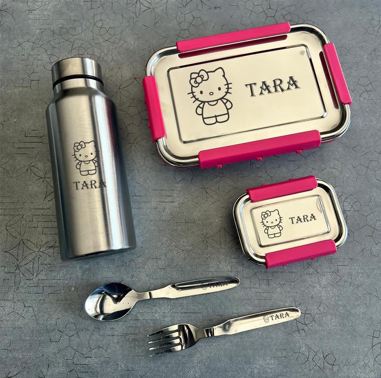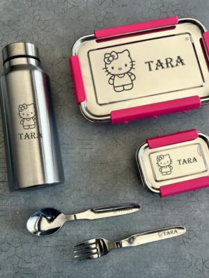 🔹Scope of name and cartoon customised on lunch box and bottle with fork and spoon