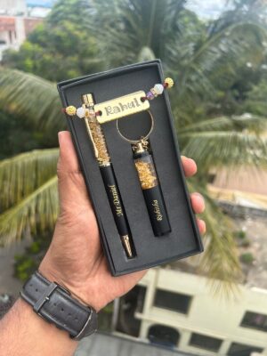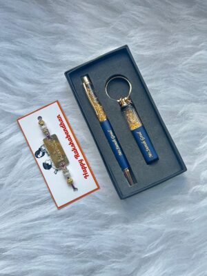 A perfect Rakhi gift containing a customized Pen and Keychain for your brother. Surprise your brother with a personalized gift and celebrate Raksha Bandhan by tying a Customized Acrylic Name Rakhi that’s designed especially for your brother.