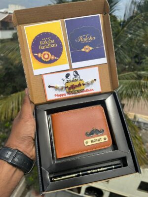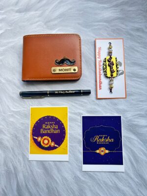 A perfect Rakhi gift containing a customized Wallet and Rakhi for your brother. Surprise your brother with a personalized gift and celebrate Raksha Bandhan by tying a Rakhi that’s designed especially for your brother. With the customized name on Rakhi, you can have Pen and Raksha Bandhan cards.