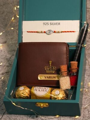 A perfect Rakhi gift containing a customized Wallet and Rakhi for your brother. Surprise your brother with a personalized gift and celebrate Raksha Bandhan by tying a Rakhi that’s designed especially for your brother. With the customized name on Rakhi, you can have Pen and Chocolates.