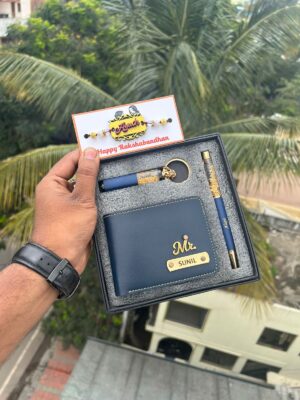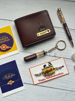 A perfect rakhi gift containing a customized wallet and rakhi for your brother. Surprise your brother with personalized gifts and celebrate Raksha Bandhan by tying a rakhi that’s designed especially for your brother. With the customized wallet, you can have a pen. Includes rakhi theme greeting cards too.
