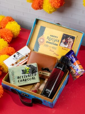 A perfect Rakhi gift containing a customized Wallet and Rakhi for your brother. Surprise your brother with a personalized gift and celebrate Raksha Bandhan by tying a Rakhi that’s designed especially for your brother. With the customized name on Rakhi, you can have Customized greeting card with Brother Sister name & 1 photo.